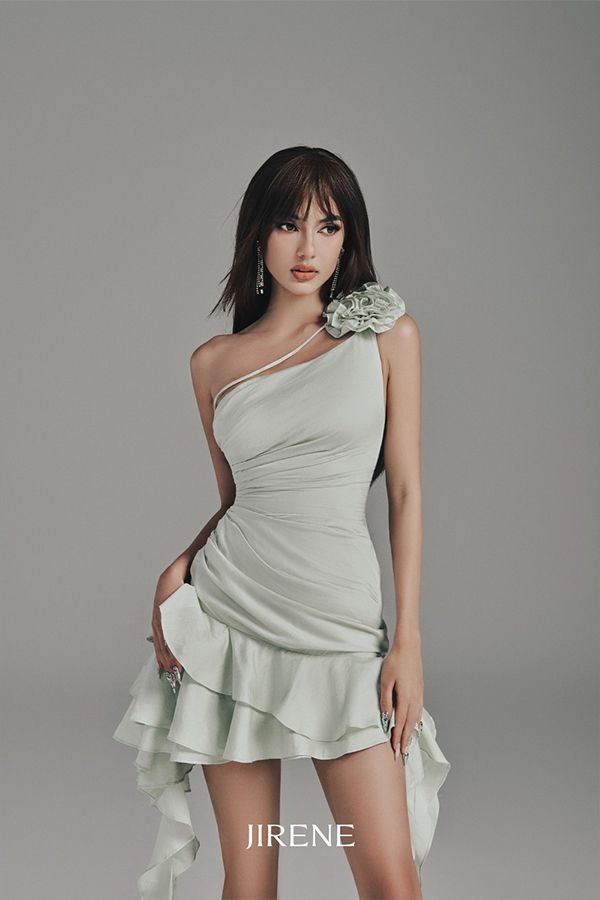 Đầm Ngắn Lệch Vai Đính Hoa JIRENE